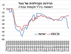 מרבית נתוני המאקרו שפורסמו עדיין לא משקפים את השפעת הסגר השני, ולכן פחות רלוונטיים. לשכת התעסוקה דיווחה שנוספו 171.5 אלף איש בחל"ת, מה שמשקף תוספת של 4.2% לשיעור האבטלה הרחב. בשבוע האחרון (עד ה- 29.9) מסתמנת ירידה ברכישות בכרטיסי האשראי בפרט במסעדות, תיירות ורכישת מוצרי ביגוד, רהיטים ואלקטרוניקה. מדד הניידות של גוגל למקומות עבודה מצביע על ירידה של 35% בשבוע האחרון (ירידה של 50% מתחילת משבר הקורונה), זאת בניגוד למגמת השיפור במדינות OECD: