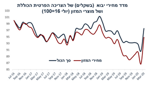 ברבעון א' מחירי היבוא של מוצרי הצריכה עלו דולרית ב- 0.5% ומחירי המזון עלו ב- 1.6%. בשקלים מחירי היבוא עלו בשיעור חד יותר (סביב 4%-5%) בשל הפיחות (הזמני) בשקל בחודש מרץ בשיעור של 5.4% ל- 3.61 ₪ לדולר. מאז השקל יוסף בחזרה בכמעט 5%. מחירי המזון בישראל עלו ב- 2.2% מינואר לאפריל.