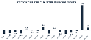 השקל יוסף בשבוע האחרון ב- 1.0% מול סל המטבעות (וב- 2.7% מתחילת השנה). באפריל גופים מוסדיים רכשו מט"ח נטו בהיקף של 1.1 מיליארד דולר, רגיעה לאחר רכישות של 10.3 מיליארד בחודש מרץ. באפריל, מוסדיים רכשו נכסים בחו"ל בהיקף של 3.2 מיליארד דולר והגדילו את הגידור ב- 2.1 מיליארד דולר. היקף רכישות האג"ח של המוסדיים מאד מושפע מהתנודתיות בשווקים. אנו ממשיכים להניח ייסוף קל בשנה הקרובה עם המשך התערבות של בנק ישראל.