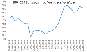 השקל נחלש ב- 1.8% מה- 3.9.20 (מול סל המטבעות) ועד אתמול. עצבנות (וירידות) בשוקי המניות (בעיקר בחו"ל) תומכת ברכישת מט"ח על ידי גופים מוסדיים ישראלים. בנוסף, חוסר וודאות לגבי השלכות הסגר השני ותקופת הימשכו גם תומכים בשקל חלש יותר.